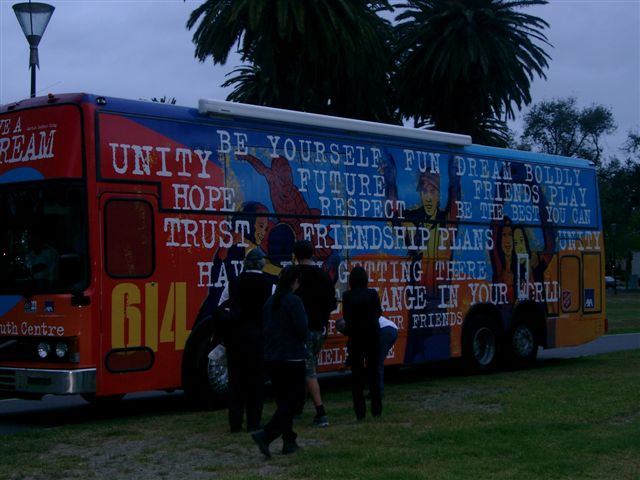 Secondly, there is the ingenuity of the preaching station, or the ‘Battery’. This was something we carried over from Methodist days, but what a practical way to get the message out. The modern day equivalent has to be the ‘gospel bus’ …you know, buses that are driven into areas of a community and opened up for people to come on. I know that the 614 Melbourne (see picture above) folks have one and I know, here in the UK, that the Church Army have one or two as do the Jesus Army. The idea of a mobile unit to take the gospel and the Army’s message is still a valid idea.